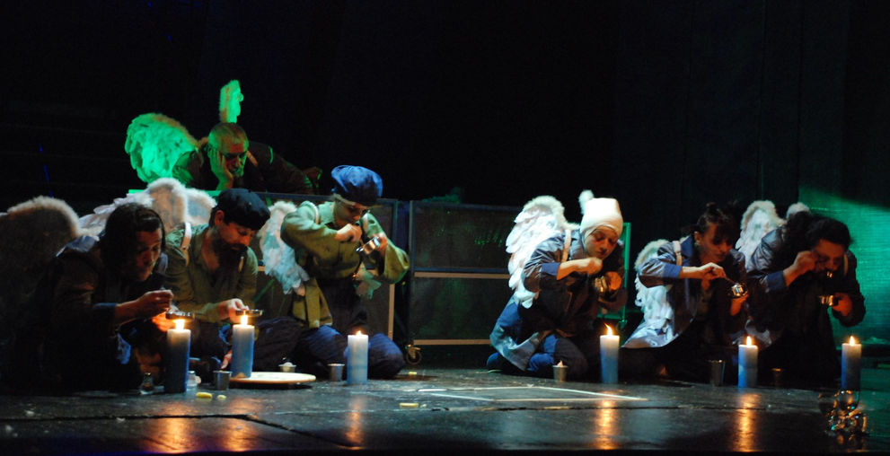 A restaurant owner has the brilliant idea to hire personal service that is only terminally ill (and noncontagious). And customers who come, come to eat the show of death. Nona Ciobanu, the director of this show gets very far. Images of a broken life, tragedy, dark comedy, all happening in a huge grotesque framework, that's what she manages to create. The two archangels: Michael, Mihaitza (Alexander Repan) and Gabriel-Gavrila (Cristi Iacob) take the brunt of the show and go together beautifully, in a chemistry of a relationship built with humor and truth. Nona Ciobanu brought a mirror so that the border between real and imaginary could be more easily passed. It is a huge projection screen. Faithful to reality at the beginning of the performance the mirror is then becoming more distorted. I recommend the performance to anyone. Maybe not everyone. If you have a problem with profanity, then be careful. You will have a revelation: angels are cursing!